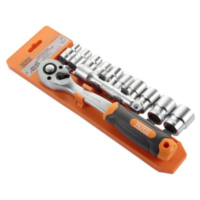 - Composición completa del juego: 10 vasos de 1/2” (10, 11, 12, 13, 14, 15, 17, 19, 22 y 24 mm), 1 carraca de 72 dientes con inversor y expulsor, 1 alargadera de 100 mm