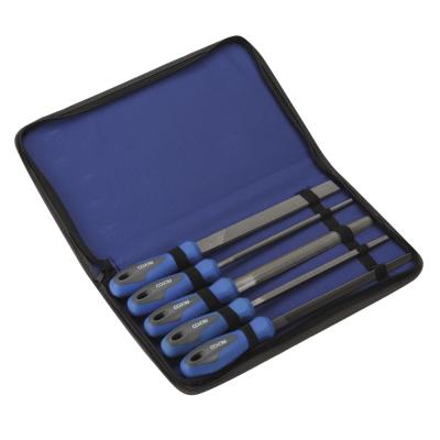 - Incluye lima plana, media caña, redonda, cuadrada y triangular, en estuche de poliéster con cremallera